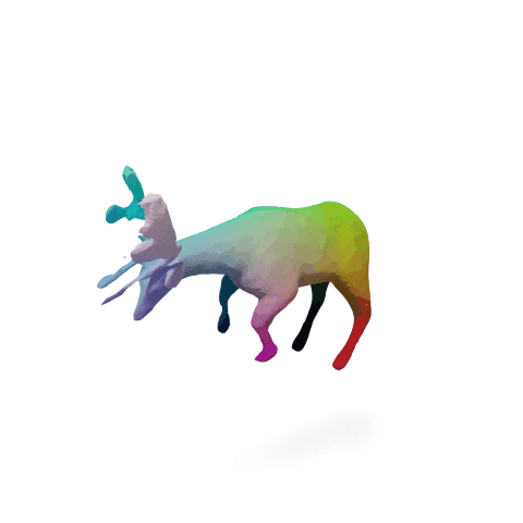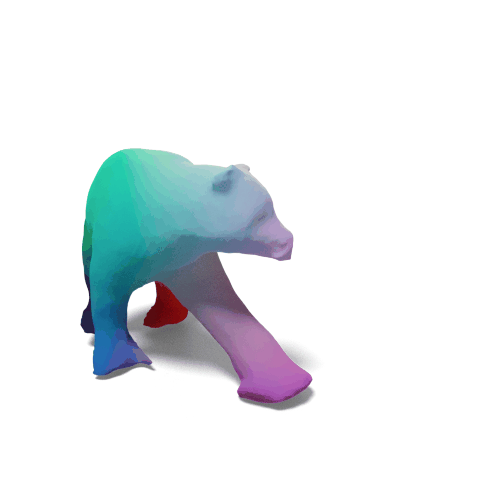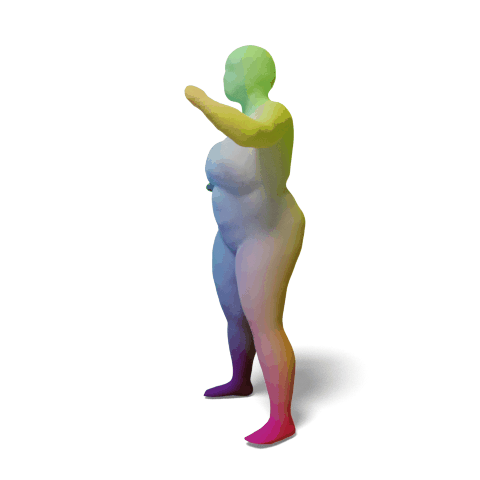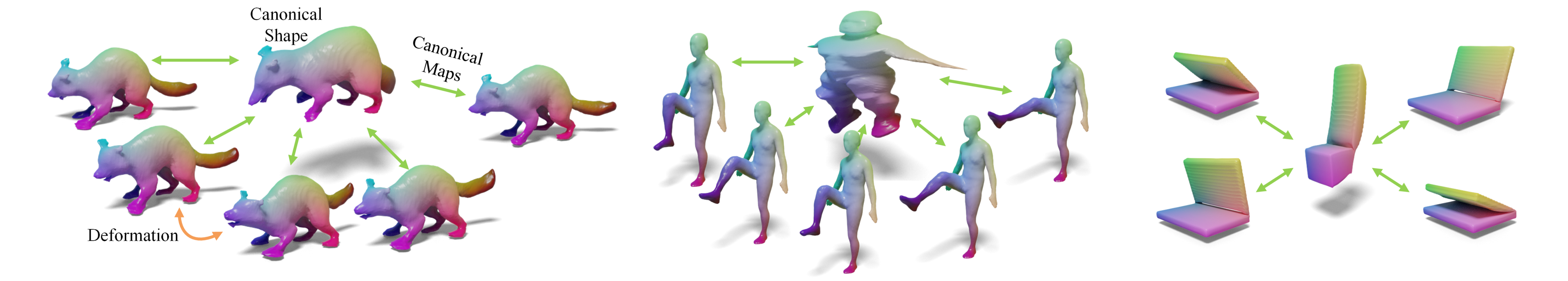 We factorize the deformation between deformed surfaces as learnable continuous invertible canonical maps (green bidirectional arrows) through a learnable canonical shape. (If the topology is not changed)