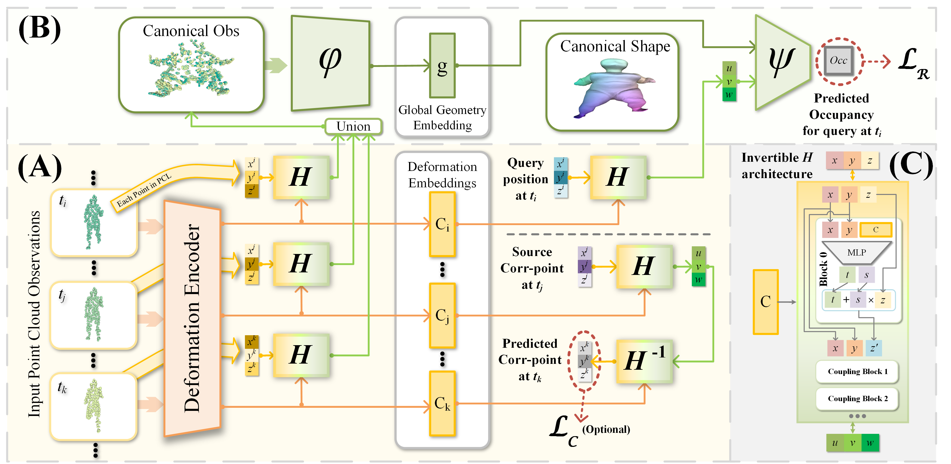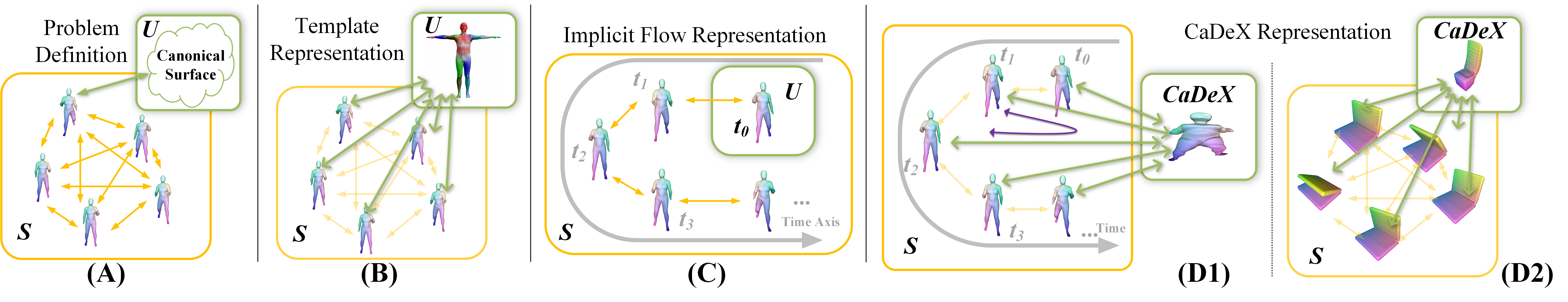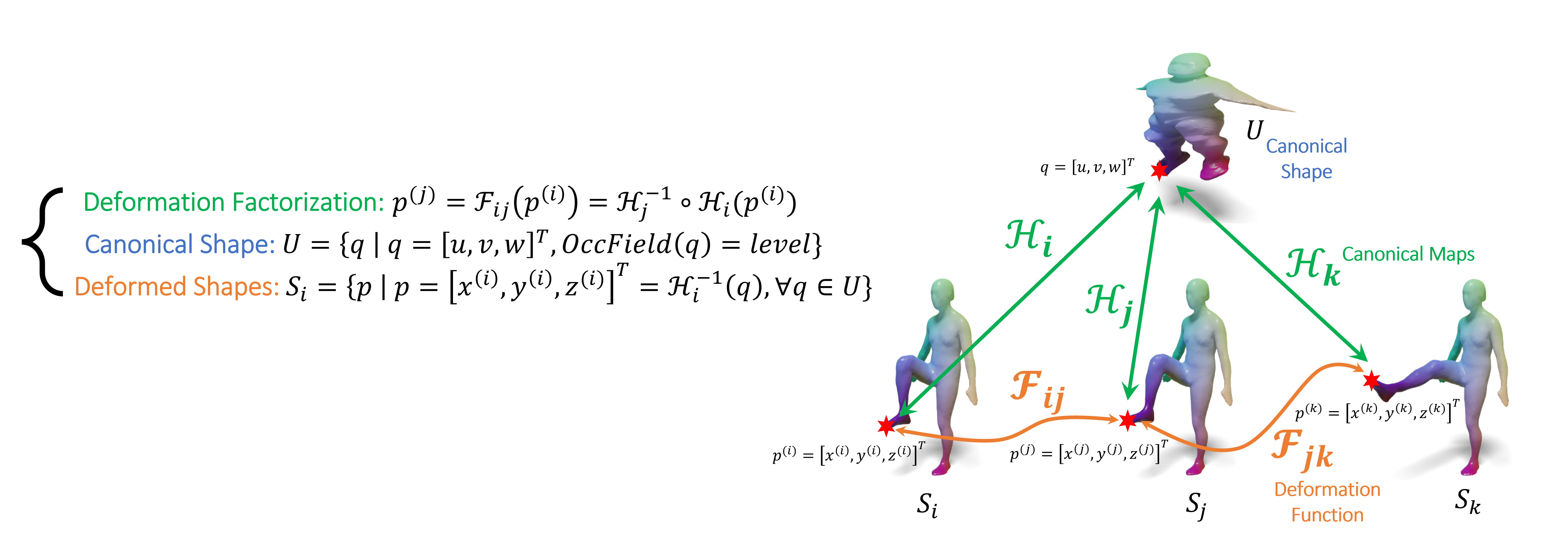 We model a deformable object as a canonical shape U (marked in the green box) and the consistent deformation functions (yellow arrows) between deformed shapes.