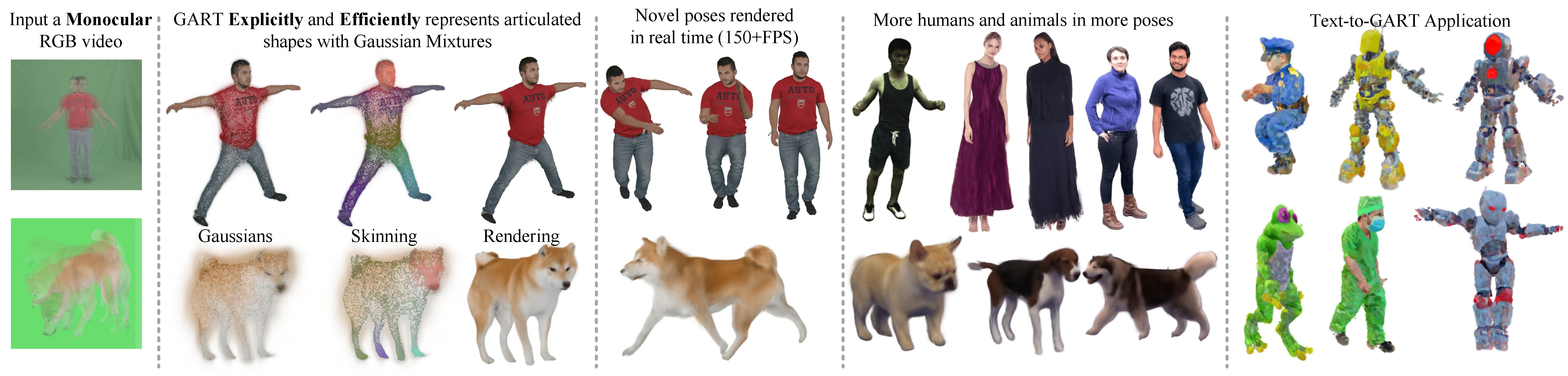 bones. GART can be reconstructed via differentiable rendering from monocular videos in seconds or